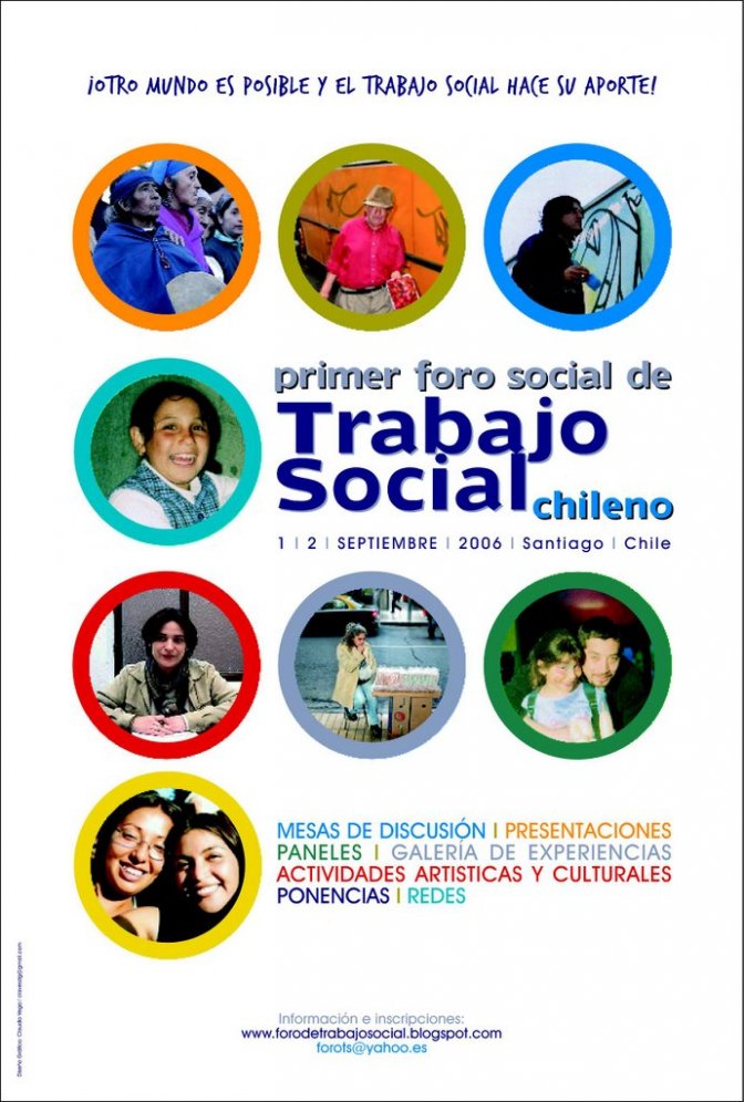 Después de muchas horas de discusión y no pocos y ricos debates, sale a la luz la convocatoria al Primer Foro Social de Trabajo Social Chileno, Foro temático a realizarse los primeros días de Septiembre. Por su caracter, los temas que abordará y la gran expectativa existente en torno del Congreso Mundial de Escuelas de Trabajo Social a realizarse esa semana, el Foro marcará un hito de grandes dimensiones en el quehacer del Trabajo Social Chileno. Ruego difundir ampliamente entre sus contactos y a sumarse a la convocatoria a través de sus organizaciones, Proyectos y/o instituciones.