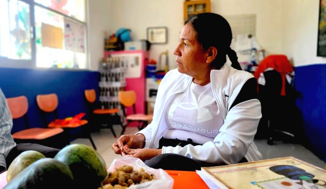 Depuis l’arrivée du crime organisé, nous ne pouvions plus nous montrer en train d’organiser les gens dans le village, c’était trop dangereux. Alors, au sein de l’école nous avons commencé à travailler sur des projets pour la communauté : le jardin et le compost de l’école, et nous nous sommes battues pour la cantine et pour de nouvelles salles de classe. Nous faisions des demandes au nom des droits de l’enfant, mais en réalité, il y avait derrière toute l’organisation des femmes de la communauté.